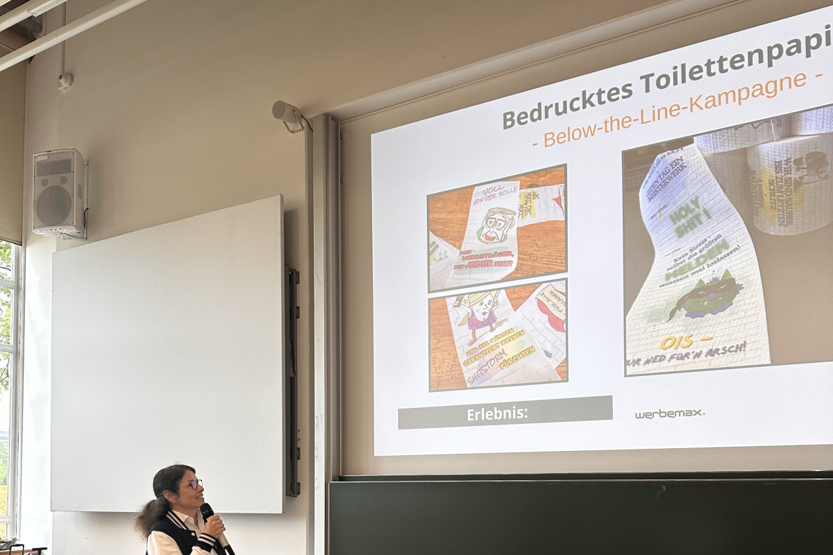 Ein Höhepunkt der Präsentation: bedrucktes Toilettenpapier mit frechen Sprüchen als Guerilla-Maßnahme auf einer Bewerbermesse. Ein klassisches Beispiel für gelungenes Below-the-Line-Marketing, das polarisiert, auffällt – und im Gedächtnis bleibt.
