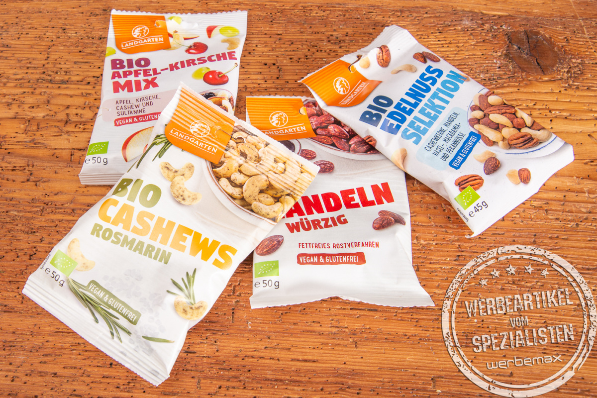Snacks sind mehr als nur kleine Momente voller Genuss – sie sind Emotion, Lebensgefühl und ein Statement. In einer Welt, in der bewusste Ernährung und Nachhaltigkeit immer wichtiger werden, setzen Bio-Snacks ein starkes Zeichen. Die hochwertigen Bio-Snacks von Landgarten verbinden Genuss mit Verantwortung – und genau das macht sie zum perfekten Werbeartikel! Ob auf Messen, als Streuartikel oder als wertschätzende Kundenpräsente: Mit den köstlichen Bio-Snacks hinterlassen Sie einen bleibenden Eindruck.