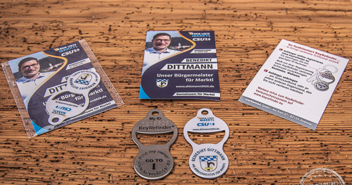 Überzeugen Sie Ihre Wähler mit kreativen Werbeartikeln, wie der Werbekarte, der Multi-Card mit Filmmarkern oder dem JOHANN Keyrefinder. Alle Artikel eignen sich durch die Werbefläche für ein Foto, Botschaften und Hinweise für die Wahl.