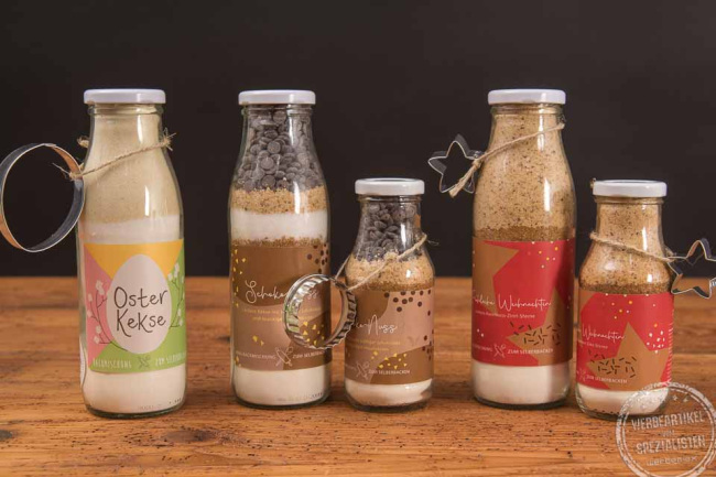 Warum nicht mal eine Backmischung im Glas als Werbegeschenk für Ihre Kunden und Mitarbeiter! Denn gerade wenn man auf der Suche nach einer praktischen und zugleich kreativen Werbegeschenk-Idee ist, sind Backmischungen nach Ihren besonderen Wünschen zusammengestellt, genau die richtige Wahl. Denn gerade Backen und der anschließende Genuss schaffen oft mit positiven Emotionen wie Freude und werden mit Ihrer Marke in Verbindung gebracht. Wie wäre es z.B. mit einer Brownie-, Cookies-, Weihnachts-, Ostern- oder Plätzchen-, Brot oder Kekse-Backmischung. Die Möglichkeiten an Rezepten für Ihr Geschenk Kuchen im Glas sind vielfältig und das Etikett auf dem Glas kann ganz individuell mit Ihrem Firmenlogo, einer Botschaft oder einem Spruch gestaltet werden. Bestellen Sie jetzt gleich Ihren Kuchen im Glas oder Ihre Kekse zum Selberbacken. Gerade an Ostern oder Weihnachten ist Zeit für Kekse und Plätzchen backen. Dazu noch die passende Ausstechform wählen, fertig ist das Geschenk.