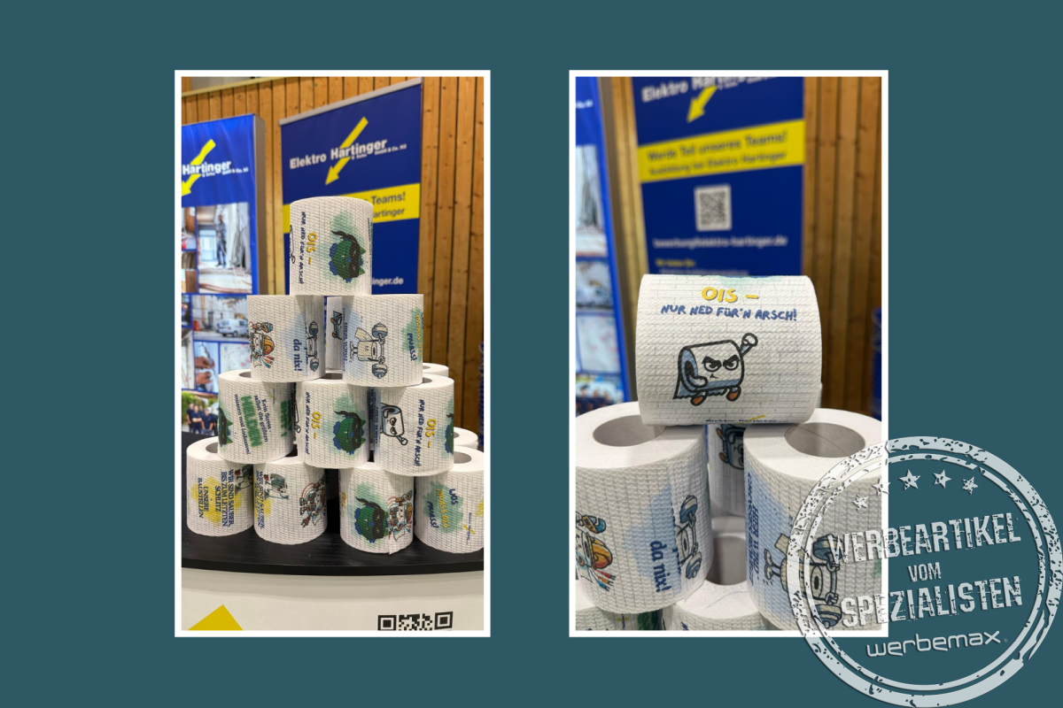 Elektro Hartinger zeigt, wie man ein ausgefallenes Werbemittel clever und aufmerksamkeitsstark auf der Messe inszeniert. Ob als Gesprächseinstieg oder als bleibende Erinnerung - am Messestand von Elektro Hartinger sorgte das bedruckte Toilettenpapier mit witzigen Sprüchen für Aufmerksamkeit und Schmunzeln. Ein sympathisches Beispiel für mutiges Marketing.