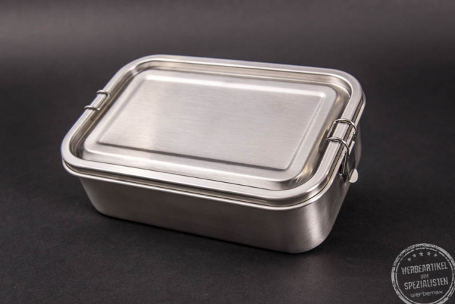 Für das Grundmaterial Edelstahl spricht vor allem die Robustheit und die Langlebigkeit. Im Vergleich zu Alu-Brotzeitdosen sind diese auf alle Fälle länger einsetzbar und auch für die Spülmaschine geeignet. Die Alternative wäre noch eine Brotzeitdose aus Kunststoff. Diese haben als Schwachstelle meist die Öffnungslasche. Diese bricht leichter ab bei täglicher Nutzung bzw. schließt dann nicht mehr so gut. Ebenso ist bei Edelstahl das Logo per Lasergravur dauerhaft angebracht, währenddessen ein Druck auf Kunststoff bei dauerhafter Nutzung und Reinigung in der Spülmaschine mit der Zeit verblasst.