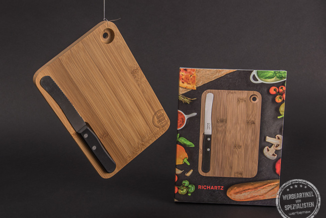 Unser Lieblingsset wenn es um Brotzeit geht und unter 10 EUR Budget zur Verfügung steht. Mit dem Markenprodukt von RICHARTZ, dem Set "Cut & Eat", haben Sie einen tollen Geschenkartikel, der laufend zum Einsatz kommt. Das moderne Allzweckmesser mit Wellenschliff eignet sich ideal für die Frühstückssemmel bzw. dem Brötchen oder auch für Tomaten, Radieschen, Gurken und mehr. Das schöne Holzbrett verfügt über eine Magnethalterung und einem Aufhänge-Loch, so bleibt das Set immer praktisch zusammen. Es stehen Ihnen drei Messerfarben zur Verfügung. Das neutrale schwarz und zwei Trendfarben - nämlich orange und limettengrün. Die Werbeanbringung löst man am besten per Lasergravur auf dem Messer. Eine Gravur ist auch auf dem Holzbrett möglich, jedoch nur mit klaren Schriftzügen, da bei filigranen Motiven das Holz ausbrechen könnte.