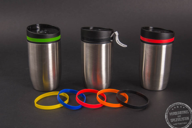 Der trendige Refill-Thermobecher ist perfekt geeignet für unterwegs. Das doppelwandige Edelstahlgehäuse sorgt für guten Wärmeschutz für den Inhalt. Der Becher bietet ein Volumen von 300 ml und passt unter fast alle Kapsel-/Padmaschinen und Kaffeevollautomaten. Der Easy-Clickverschluss bzw. Drückknopf sorgt für Sicherheit beim Öffnen und Schließen. Der Becher ist gegen Auslaufen geschützt und für die Spülmaschine geeignet. Durch die farbigen Ringe kann ein Farbakzent, passend zur Logo-/Unternehmensfarbe, gesetzt werden.