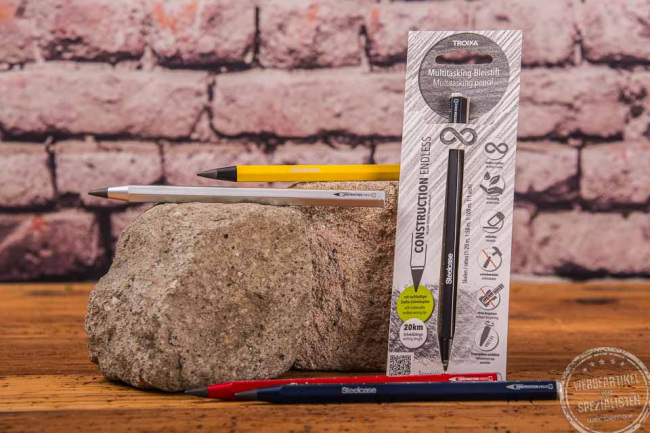 Dieser Bleistift CONSTRUCTION Endless ist kein gewöhnlicher Stift. Er muss weder angespitz werden, noch kann seine Mine brechen. Seine Graphit-Mine ist eine Endlosschreibspitze in HB mit bis zu 20.000 m Schreiblänge. Sie kann zudem ausgetauscht werden, was den nachhaltigen Aspekt dieses Bleistifts nochmals unterstreicht. Die Ersatzminen sind im Fachhandel sowie Online als 3er-Pack erhältlich. Gemäß des Konstruktionsgedankens verfügt dieser Grafitstift über ein Zentimeter- und Zoll-Lineal mit einer 1:20- bzw. 1:50-Skala. Er eignet sich besonders für Mitarbeiter handwerktlicher Betriebe, Bauunternehmen, Ingenieure etc. und ist ein ständiger Begleiter im beruflichen, aber auch privaten Alltag. Der Graphitebleistift kann auf Studentenmessen an Universiäten und Fachhochschulen sowie für das Bewerbermarketing eingesetzt werden.