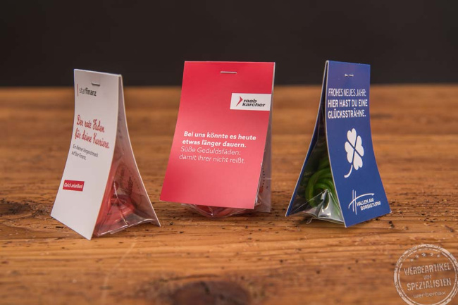 Süße Werbung macht Freude! Die Naschtasche gefüllt mit Fruchtgummis Ihrer Wahl als Werbeartikel macht dabei besondere Freude. Sie wählen zwischen zahlreichen Süßigkeiten als Befüllungsmöglichkeit aus. Wie wäre es z.B. mit Fruchtgummi Schnüre in Ihren Firmenfarben. Hierzu passen folgende Botschaften: "Damit läuft es wie am Schnürchen!", "Kabelsalat", "Wir ziehen an einem Strang", "Bleiben wir in Verbindung" oder einfach die Herzen um Danke zu sagen. Den Beschriftungsmöglichkeiten der Naschtaschen-Klappkarte sind keine Grenzen gesetzt. Ob Logo, Markenbotschaft oder lässiger Spruch, die Naschtasche mit Fruchtgummmi oder Gummibären gefüllt, ist definitiv ein cooler Werbeartikel. Die große Werbefläche lässt sich beidseitig vollflächig bedrucken. Die Naschtasche eignet sich sehr gut als Mailingartikel, Streuartikel auf Messen & Events oder auch als Give-Away beim Bewerbermarketing.
