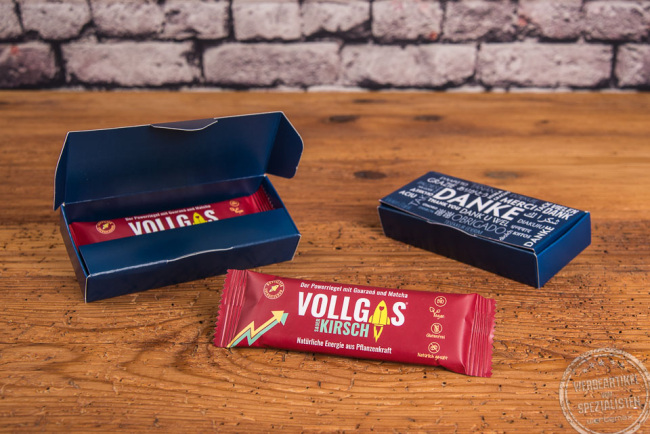 Wir schlagen den Vollgas-Energie-Riegel vor allem auf Messen und Promotions an Universitäten und Hochschulen vor, auf Bewerber- und Azubi-Messen. Ebenso eignet er sich als Energy-Boost auf Veranstaltungen, Messen, Events. Bei Schulungen, Seminaren und Tagungen ist er ein toller Pausensnack oder ein trendiges Begrüßungsgeschenk auf dem Platz. Auch als Mailing für Vertriebsaktionen liefert der Powerbar-Riegel eine Kommunikationsbrücke, z.B. mit Vollgas ins neue Jahr, Back to business, Jetzt aber schnell Vorteile sichern. Aber auch als Mitarbeitergeschenk zu Geburtstag, als kleine Motivation zwischendurch oder bei neuen Projekten. Die große Werbefläche sorgt dafür, dass Ihre Botschaften, Ihr Kampagnenmotiv, Ihr Motto perfekt ins Auge fallen. Der FSC-zertifizeirte Karton kann 4-farbig außen, aber auch innen bedruckt werden.