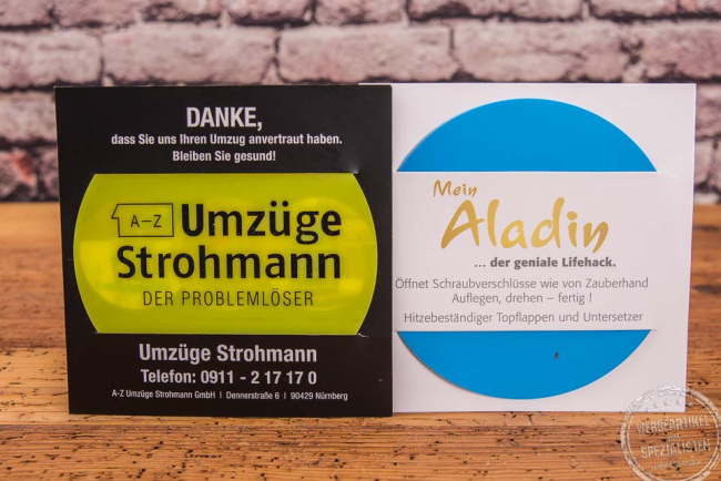 Dieser Untersetzer ist in vielerlei Hinsicht magisch, da er so einige versteckte Talente bereit hält. "Aladin" ist ein praktischer Helfer in der Küche und erleichtert das Kochen und Servieren. Er ist als klassischer Topfuntersetzer verwendbar, das ist jedoch nicht alles. Als Topflappen bzw. Ofenhandschuh erleichtert er das Anfassen heißer Töpfe, Auflaufformen oder von heißem Geschirr. Daneben unterstützt er Sie bei der Verwendung von Einweggläsern oder Flaschen, indem er einfach über den Verschluss gelegt wird und man das Gefäß leichter Öffnen kann. Der Topfhandschuh ist in fünf Standardfarben erhältlich und mit Ihrem individuellem Motiv veredelbar. Dieser Werbeartikel ist ein funktionelles Give Away für Mitarbeiter, Kunden oder als Mailingartikel einsetzbar.