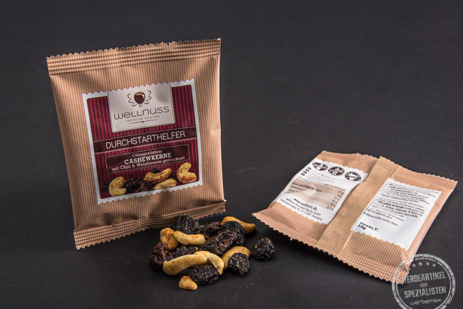 Wir halten die WELLNUSS-Flowpacks als attraktive Alternative zu den auf Messen im Überfluss eingesetzten Fruchtgummi-Tütchen. Denn man wirbt nicht nur anders, sondern auch gesund. Dass man fünf Stück Obst pro Tag essen sollte, wissen die meisten. Aber wussten Sie auch, dass 25 Gramm Nüsse laut Deutscher Gesellschaft für Ernährung als eine Portion Obst zählen? Denn dank ihres günstigen Fettsäureprofils und Inhaltsstoffen wie Aminosäuren, Magnesium, Ballast- oder sekundären Pflanzenstoffen sind sie ein echter Gewinn für jeden Speise- beziehungsweise Snackplan. Somit eignen sich die WELLNUSS Snacks als kleiner Energiespender im Flowpack auf Messen, bei Seminaren und Tagungen sowie auf Veranstaltungen. Ob fruchtig, süß oder scharf, drei Sorten stehen Ihnen zur Auswahl: der Energiespender aus Cashewkernen und Cranberries ist mal ein hochwertiges Gegenstück zum Studentenfutter und für viele Zielgruppen geeignet, die Glücksbringer aus Trüffelmandeln mit Kakao sind gerne bei Hotels als "Betthupferl" oder als süßer Gruß für den Kaffee als Begleiter eingesetzt und der Durchstartehelfer aus Cashews mit Chili und Weinbeeren ist die etwas schärfere Variante des Energiespenders. Die Flowpack-Verpackung wurde 2016 mit dem German Design Award ausgezeichnet. Seit 2019 wurde die Verpackung weiter optimiert und besteht inzwischen aus 59% Papieranteil. Die Veredelung ist auch einfach gelöst: Möglich macht das ein spezielles Produktionsverfahren, das für wellnuss Premium Snacks entwickelt wurde: Auf eine mattierte Folie in Papieroptik wird ein Etikett mit Ihrem Motiv aufgeklebt.